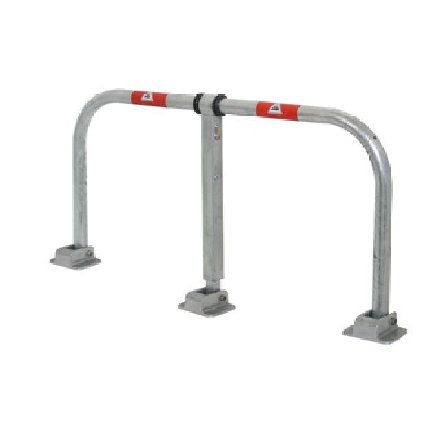 Parkplatzsperrbügel 472V -umklappbar- Höhe ca. 450 mm, Breite ca. 850mm, mit Messingschloß, zum Aufdübeln, verz. mit roten Reflexstreifen incl. Befestigungsmaterial