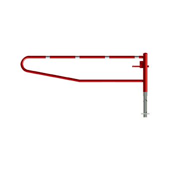 Horizontal schwenkbare Schranke ohne Auflagepfosten. Verriegelung geschlossen oder geöffnet mit Steckbolzen, vorgerichtet für Vorhangschloss oder Dreikantverschluss nach DIN 3223 bzw. Profilzylinderschloss.