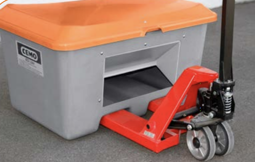 Der einfache Gebrauch und das Handling steht bei vielen Kommunen im Vordergrund. Die Unterfahrbarkeit in Verbindung mit der Stapelbarkeit erleichtert das Ein- und Auslagern der Streugutbehälter enorm und spart Zeit und Platz.